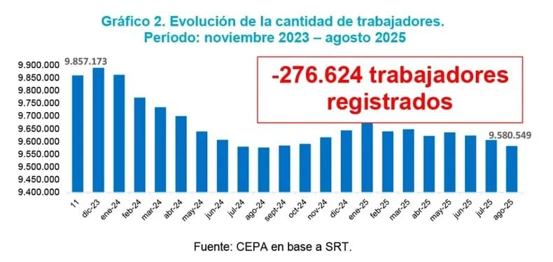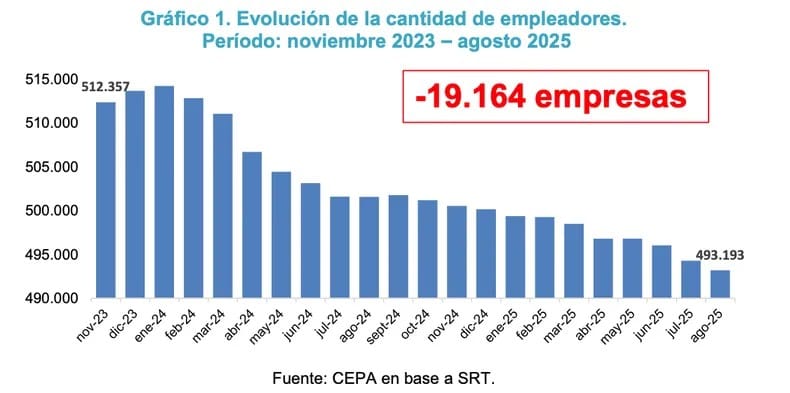 Entre noviembre de 2023 y agosto de 2025, 19.164 unidades productivas dejaron de operar y se destruyeron 276.000 puestos formales, según datos de la Superintendencia de Riesgos del Trabajo analizados por el CEPA.