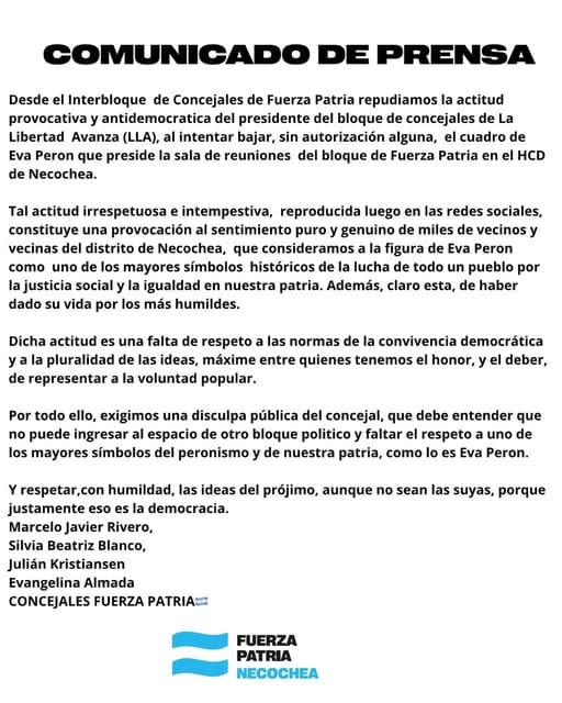 Tanto desde el interbloque de concejales de FP-MDF como desde el PArtido Justicialista así como demás expresiones vertidas `por medio de las redes, se condena la provocación que implica una clara provocación que rompe con la tradición de convivencia democrática que ha tenido el Concejo Deliberante de Necochea.