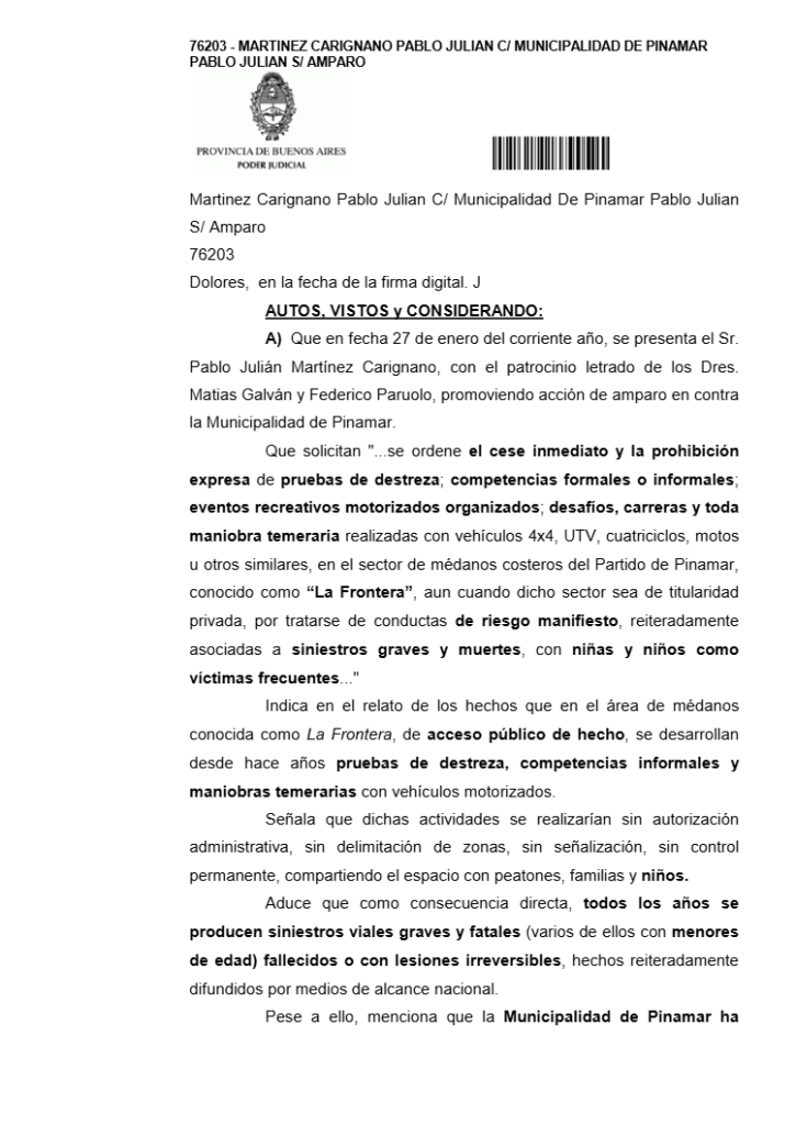 La resolución judicial se originó a partir de una acción de amparo presentada contra la Municipalidad de Pinamar, en la que se advirtió sobre los peligros que implican las competencias informales, pruebas de destreza y maniobras temerarias que desde hace años se desarrollan en ese sector, especialmente durante la temporada de verano.