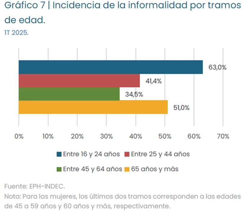 El fenómeno afecta con mayor fuerza a los jóvenes: en el primer trimestre del año, la informalidad en el rango de 16 a 24 años llegó al 63%, es decir, 6 de cada 10. También persiste una brecha de género: en promedio, la tasa femenina supera en 2 puntos porcentuales a la masculina.